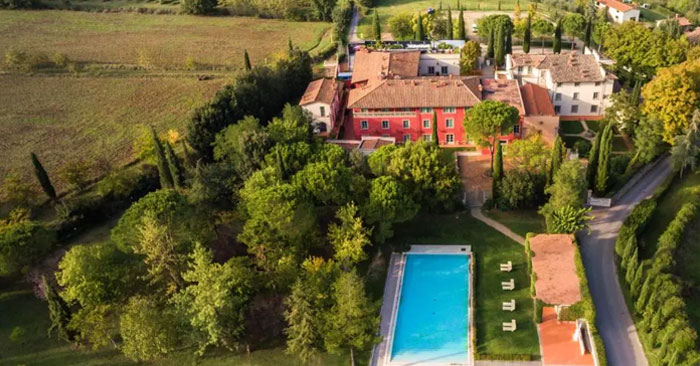Floransa’dan 45 dakika uzaklıkta Chianti bölgesinde yer alan villada ana suit dahil dokuz tane çift kişilik oda, etkinlikler için dev bir alan, yüzme havuzu, tenis kortu, gölün yanı sıra konuklar için bir konsiyerj hizmeti de bulunuyor.