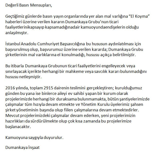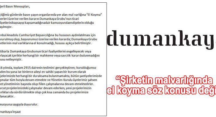 15 Temmuz Darbe Girişimi sonrası FETÖ/PDY soruşturmasında ifadeleri alınan, şirketin yönetici ve ortağı 6 kişinin şahsi malvarlığına el konan Dumankaya’dan açıklama geldi.
