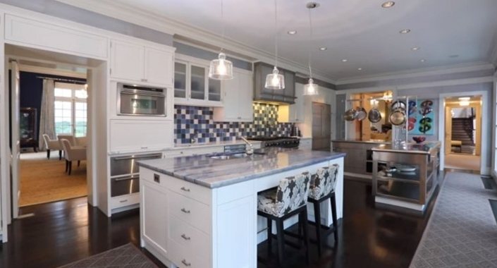 Mutfağında kullanılan özel tonlar ve mavi mermerler, içeriye ferah ve geniş bir hava katıyor.