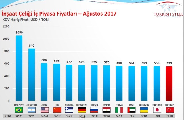 Çelik İhracatçıları Birliği, ülkelerin Ağustos 2017 satış fiyatlarını baz alarak yaptığı araştırma ile inşaat çeliğinin dünyada en düşük fiyatla Türkiye’de satıldığını gözler önüne serdi. İnşaat çeliği fiyatının en yüksek olduğu ülke ton başına 1050 dolar ile Brezilya olurken, Brezilya’yı, Arjantin, ABD ve Çin takip ediyor. Türkiyeise ton başına 555 dolar ile son sırada yer alıyor.