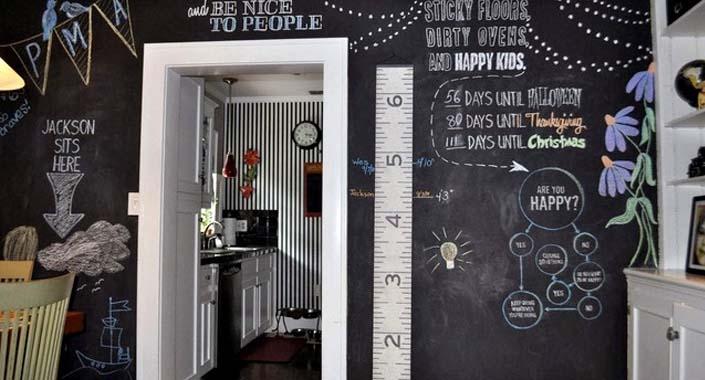İşte geldik bir başka harika fikre! Arzu ederseniz bir duvarı, arzu ederseniz bir duvarın bir kısmını mat siyah renkli, kara tahta boyası olarak bilinen boya ile boyayabilir, bu yüzeye tebeşirler istediğiniz desenleri çizebilirsiniz.