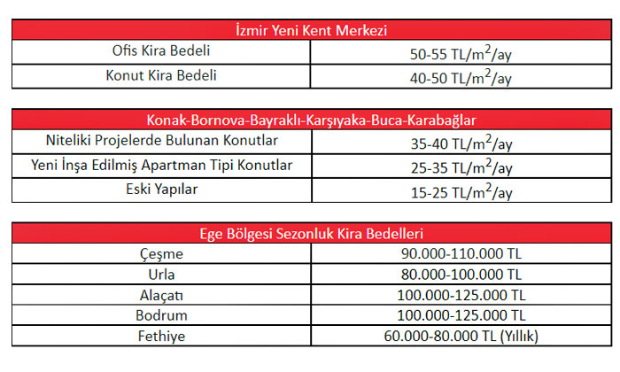 İzmir’de çalışma alanlarının çeperlerinde bulunan yerleşim yerlerinde, yeni inşa edilen ve nitelikli projeler içinde yer alan konutlarda kira bedelleri ortalama aylık 35-40 TL/m2, apartman tipi yeni konutlarda ortalama aylık 25-35 TL/m2, nispeten eski binalarda ise aylık 15-25 TL/m2 arasında değişiyor.