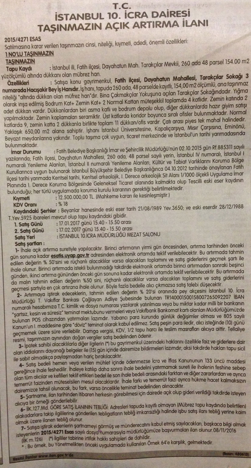 Birinci dereceden arkeolojik sit alanında kalan hanın satışı 17 Ocak 2017 tarihinde saat 15.40 ile 15.50 arasında İstanbul 10. İcra Müdürlüğü Mezat Salonu’nda yapılacak. alıcı çıkmadığı takdirde ikinci satış 17 Şubat 2017 tarihinde aynı yer ve saatte tekrarlanacak.