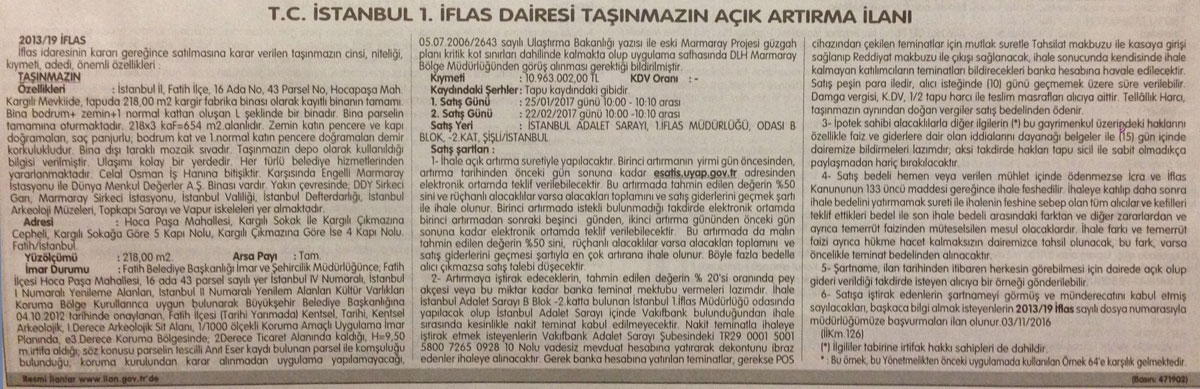 Binanın değerini 10 milyon 963 bin 2 lira olarak belirleyen mahkeme, satışı 25 Ocak 2017 tarihinde saat 10.00’da İstanbul Adalet Sarayı 1. İflas Müdürlüğü Odası B Blok 2. Kat Şişli adresinde gerçekleştirecek.