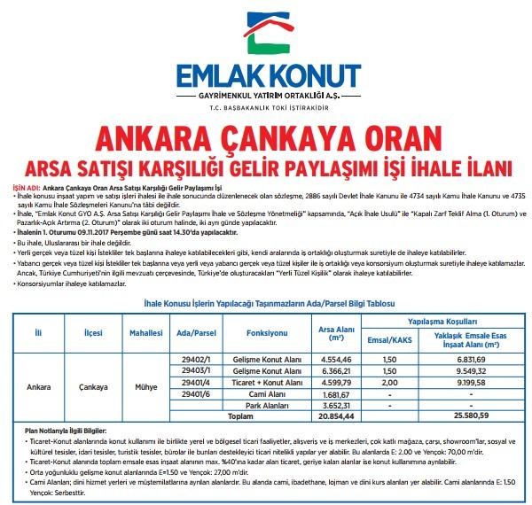 Emlak Konut GYO, Ankara Çankaya ilçesi Oran mahallesinde bulunan 20 bin 854 metrekare büyüklüğündeki arsa ihale usulüyle satışa çıkardı.