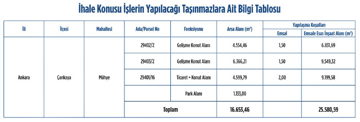 Emlak Konut GYO, Ankara Çankaya Mühye Mahallesi’nde yer alan gelişme ve konut alanı, ticari ve park alanı imarına sahip olan üç parsel arsasını ihaleye çıkardı.