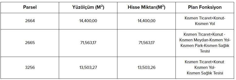 Başakşehir İkitelli 1 Mahallesi’nde yer alan 2664, 2665 ve 3256 parseldeki arsalar toplam 99 bin 465 metrekare alana sahip. 14 bin 400 metrekare, 71 bin 563 metrekare ve 13 bin 502 metrekare büyüklüğündeki arsalar üzerinde konut, ticaret alanı, sağlık tesisi, meydan ve yol inşa edilebilecek.