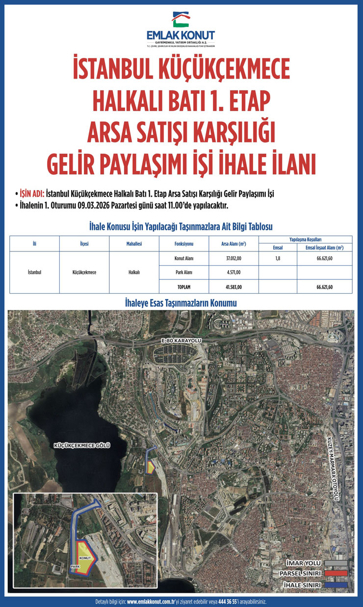 Emlak Konut Gayrimenkul Yatırım Ortaklığı A.Ş. (EKGYO), İstanbul Küçükçekmece Halkalı Batı 1. Etap Arsa Satışı Karşılığı Gelir Paylaşımı İşi için ihaleye çıkıyor.