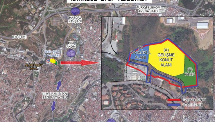 Eyüp Alibeyköy’de ihaleye çıkarılan arsa toplam 35 bin 856 metrekare yüzölçümü bulunuyor. 859 ada 6 parseldeki arsanın emsali ise 1.5 olarak açıklanırken bu değere göre inşaat alanı 33 bin 453 metrekare olarak belirlendi. Arsanın 22 bin 302 metrekaresi gelişme konut alanı, 5 bin 58 metrekaresi ortaokul alanı, 8 bin 496 metrekaresi park alanına ayrıldı. Arsada bina yüksekliği en fazla 8 kat olabilecek.