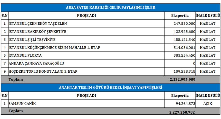 2017’de 9 adet gelir paylaşım ihalesi ile 13 milyar TL’lik değer oluşturduklarına dikkat çeken Kurum, “2017 yılı faaliyetlerimize göz attığımızda 1,27 milyar TL değerinde arsa alımı gerçekleştirdik. Mevcut 5,3 milyar TL değerindeki arsa portföyümüz içerisinden, İstanbul’da bulunan Küçükçekmece, Şişli, Bakırköy, Florya, Çekmeköy, Bahçekent gibi merkezi konumlarıyla dikkat çeken arsalarımızı 2018’de ihale etmeyi planlıyoruz.