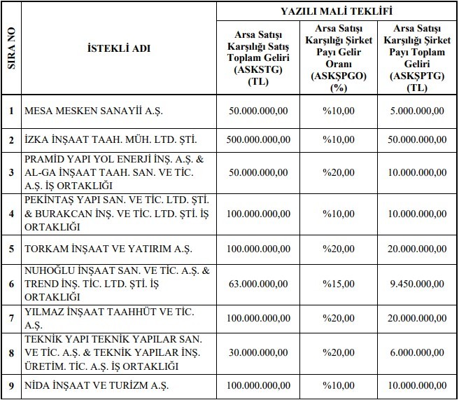 İhaleye katılan firmalar ve teklifleri şöyle: