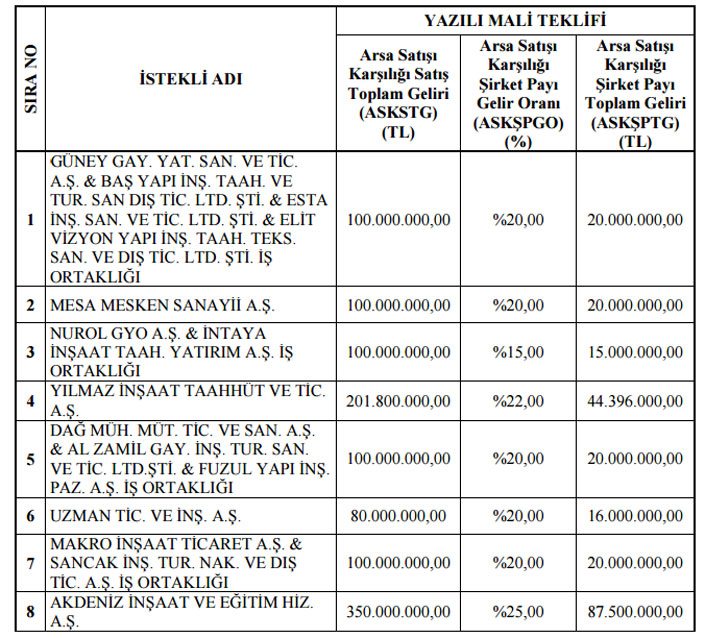 Üçüncü sırada ise 20 milyon TL’lik teklifle Güney Gayrimenkul ve ortakları, Mesa Mesken, Dağ Mühendislik ve ortakları ile Makro İnşaat ve ortağı olmak üzere 4 firma ve ortak girişim sıralandı.