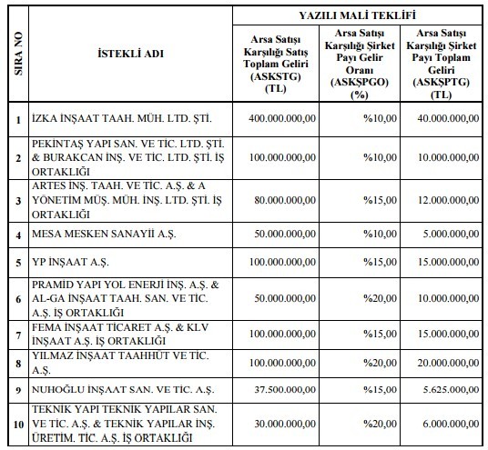 47 bin 70 metrekarelik alanı kapsayan arsa ihalesinde 10 firma tekliflerini sundu. Ticaret, turizm ve konut alanı imarına sahip 1. Etap arsası için en yüksek teklif İzka İnşaat’tan geldi. Arsa için 400 milyon TL teklif sunan İzka İnşaat Emlak Konut’a ise 40 milyon TL teklifte bulundu.