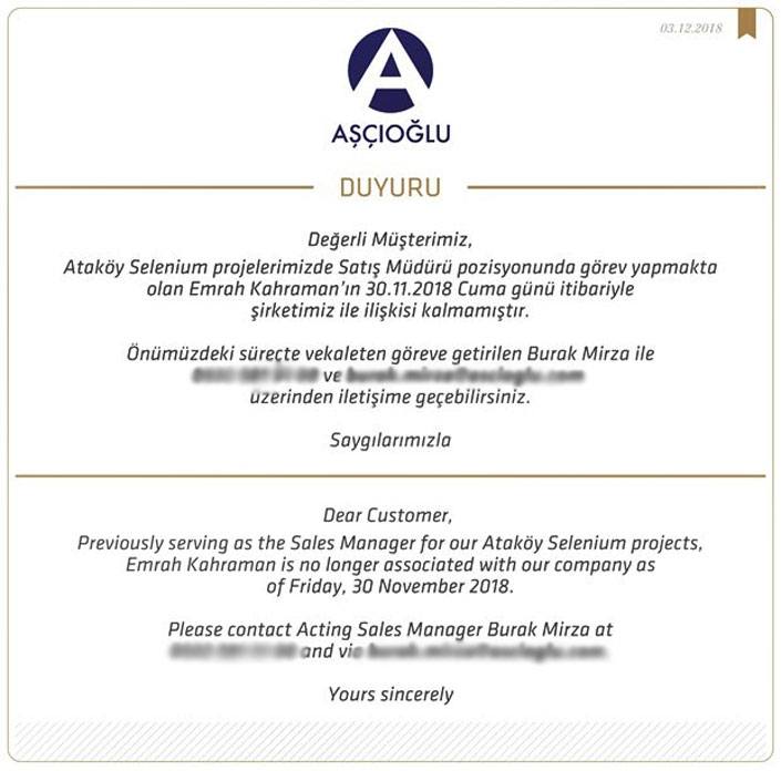 Aşçıoğlu yatırımcılarına yaptığı açıklamada Ataköy Selenium projelerinde satış müdürü pozisyonunda görev yapmakta olan Emrah Kahraman’ın 30 Kasım 2018 Cuma günü itibariyle şirketle bir ilgisi kalmadığı duyuruldu.