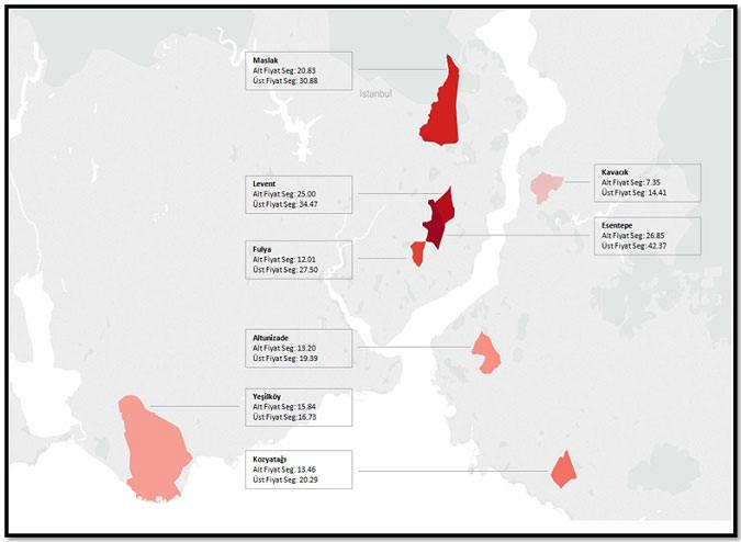 İstanbul’da en yüksek kira gelirine sahip semt yine Esentepe olurken Kartal ve Pendik ise son sıralarda yer aldı. Esentepe’de üst segment ofislerde metrekare fiyatı 42.37 dolar, alt segment ofislerde ise metrekare fiyatı 26.85 dolar oldu. En düşük kira gelirine sahip bölgelerde ise üst fiyat segmentinde 14.35 dolar ile Kartal, alt fiyat segmentinde ise 6.72 dolar ile Pendik öne çıktı.