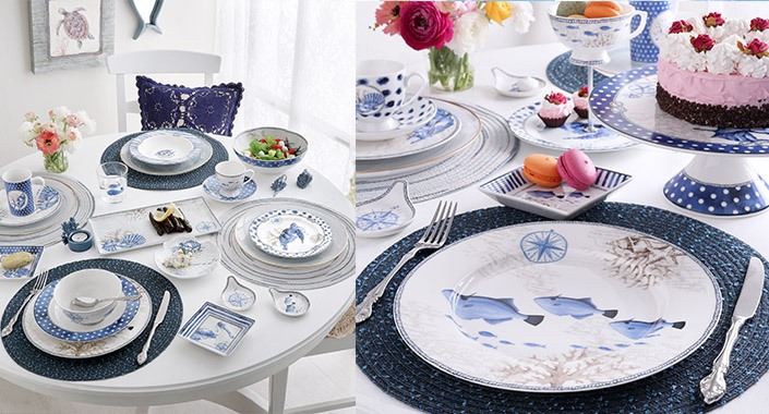 Balık figürleri ile bone china kahve fincanları, servis tabakları ve cam bardaklar, mutlu yaz köşelerinizi oluşturmanız için size fırsat tanıyor.