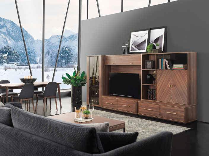 Ahşabın doğal estetiğini etkileyici bir yorumla sunan Raum TV Ünitesi şıklığı ve fonksiyonelliği buluşturuyor. Bazalı ve ayaklı olmak üzere iki farklı ölçü ve formda TV sehpası alternatiflerinin yanı sıra kitaplık, üst dolap ve vitrin gibi özel modülleriyle ihtiyaca uygun çözümler sunan Raum TV Ünitesi, altın rengi dokulu metal kulplar, bronz renk cam uygulaması, LED aydınlatma gibi incelikli detaylarıyla da dikkat çekiyor.