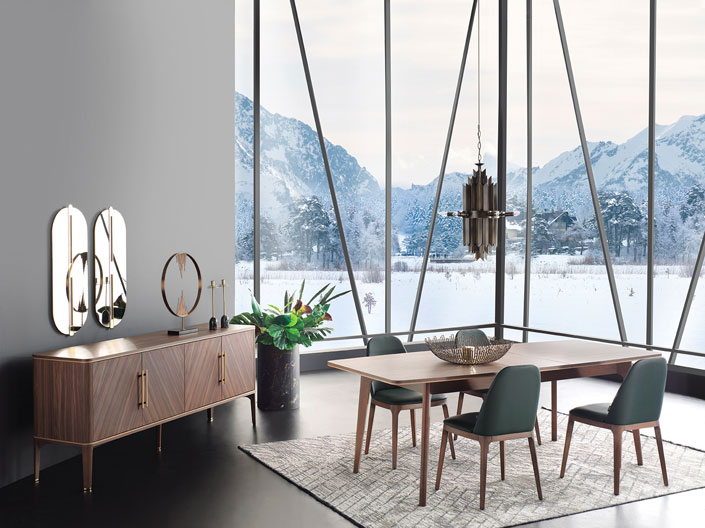 Rafine tasarım çizgisinin ahşabın zamansız duruşuyla buluştuğu Raum Yemek Odası, göz alıcı zarafetiyle dikkat çekiyor. Kusursuz işçiliğiyle fark yaratan Raum Yemek Odası, modern tarzını bronz bir aynayla şık bir biçimde tamamlıyor. Sabit ve iki farklı ölçüde açılır masa olmak üzere üç masa alternatifi bulunan Raum Yemek Odası, ekstra depolama alanı sunan seriye özel vitrin tasarımı ve konsol içinde çekmece uygulaması, vitrin içerisinde yer alan LED aydınlatmasıyla fonksiyonelliğini de gözler önüne seriyor.