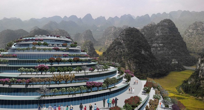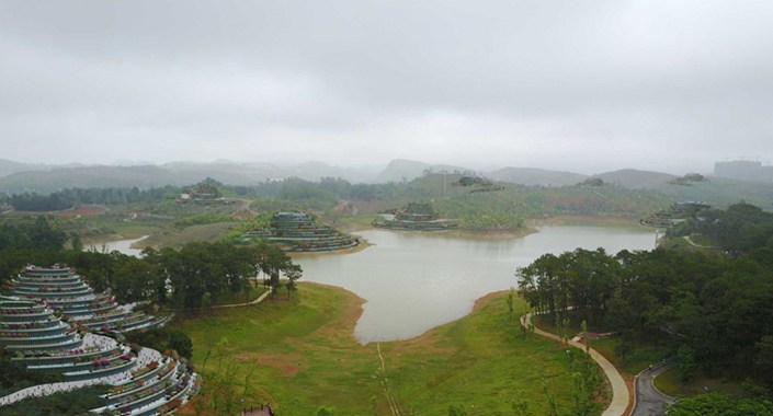 Oriental Tepeler Şehri, Xingyi Karst Dağları’ndaki panoramik manzaralı ortamlarından yararlanan 3000 konut içermektedir.