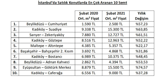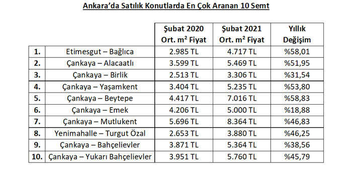 Yapılan araştırmaya göre satılık konutları en çok Ankara’nın Etimesgut ilçesinde Bağlıca’da aradık. İstanbul’un Beylikdüzü ilçesinde Cumhuriyet semti ikinci sırada yer alırken, Balıkesir’in Edremit ilçesinde Akçay, Ankara’nın Çankaya ilçesinde Alacaatlı ve Muğla’nın Bodrum ilçesinde Güvercinlik ilk beş arasında yer aldı. İstanbul ve Ankara semtlerinin ağırlıklı olarak öne çıktığı listede, İzmir, Balıkesir, Muğla, Aydın, Mersin, Samsun ve Antalya gibi denize kıyısı olan semtler de ilk 50 arasında yer aldı.
