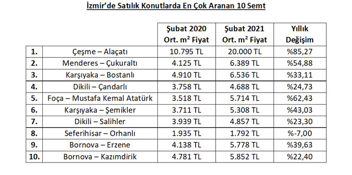 İzmir’de en çok satılık konut baktığımız semtlerin başında Çeşme’nin Alaçatı semti geliyor. Alaçatı’yı Menderes’te Çukuraltı, Karşıyaka’da Bostanlı, Dikili’de Çandarlı, Foça’da Mustafa Kemal Atatürk, Karşıyaka’da Şemikler, Dikili’de Salihler, Seferihisar’da Orhanlı ve Bornova’da Erzene ve Kazımdirik semtleri takip ediyor.