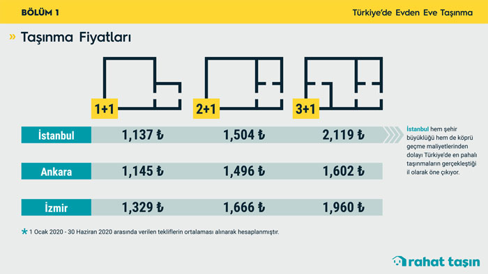 1+1 ve 2+1 evler için ortalama nakliye ücretlerinin İzmir’de İstanbul ve Ankara’ya göre daha yüksek olduğu gözlemlenirken, İstanbul 3+1 ev nakliyesinde en yüksek fiyat ortalamasına sahip. Hem şehirdeki mesafe hem de köprü geçme maliyetleri dolayısıyla tüm konutlardaki taşınma maliyetleri için İstanbul, Türkiye’deki en pahalı il olarak öne çıkıyor.