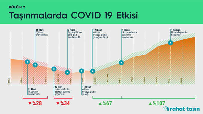 1 Ocak – 30 Haziran 2020 dönemine ait verilere göre Türkiye’de ev taşıma trendleri COVID-19’dan önemli ölçüde etkilendi. Türkiye’de ilk COVID-19 vakasının açıklandığı 11 Mart tarihinden itibaren %28-34 bandında düşüş gözlemlenen taşıma talepleri, normalleşme adımlarıyla birlikte son 2 ayda %107 artış göstererek rekor seviyelere ulaştı.