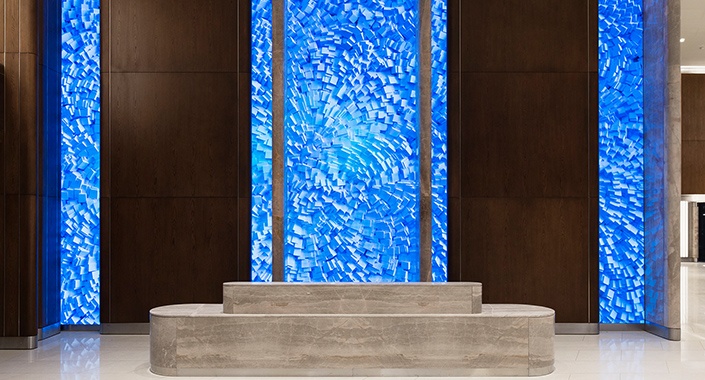 İç mimaride her zaman bir sistem yaratmak istediklerini söyleyen Autoban’ın kurucuları Seyhan Özdemir Sarper ve Sefer Çağlar, “Bu sistem binanın kendisinden geliyor. Yuvarlatılmış bir dikdörtgen forma sahip olan binanın köşelerini başlangıç noktası olarak aldık. Autoban’ın “her zaman boşluğu deneyimle tasarlıyoruz” mottosunu ortak alanlarda katmanlar üzerine kurduk. Burada da çok özgün detaylar var. Tasarımda ‘zamansız’ olduklarına inandığımız doğal malzemeleri tercih ettik. Blok mermerler kesildi, metalle birleştirildi. Araya ahşap katmanlar koyuldu.” sözleriyle mekanın hacmini izleyiciye aktaran etkileyici bir atmosferin oluşmasını nasıl sağladıklarını özetliyor.