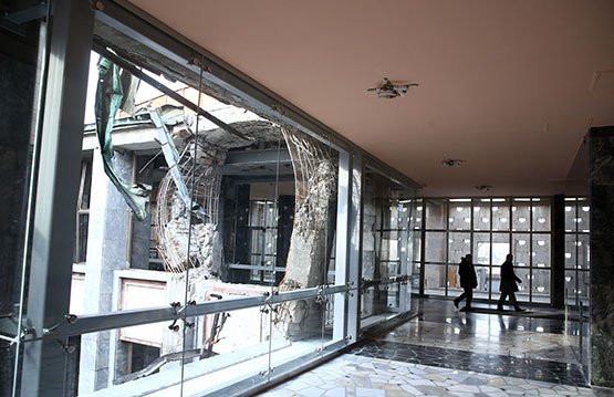 Bombanın şiddetiyle içindeki demirlerin ortaya çıktığı iki kolonun da bulunduğu iç bahçe ise ziyaretçilerin görebilmesi için kalın cam ile çevrildi. Bu görüntüler aynı zamanda yabancı misafirlere de gösterilecek.