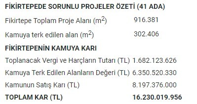 “Çevre ve Şehircilik Bakanlığı’nın seferber olduğu ve aylardır yazılı ve görsel medyada ilan edilen İmar Affı kapsamında toplanan para tutarı 16,5 milyar TL’dir. Halen Fikirtepe’de sorunlu proje alanı 916.381 m2, toplam inşaat alanı 7.331.048 m2 ve toplam satılabilir alan 3.775.490 m2’dir. Fikirtepe’de tüm bu projelerin tamamlanması durumunda, bu alandan toplanacak vergi ve harçların tutarı 1.682.123.626 TL, kamuya terk edilen alanların değeri 6.350.520.330 TL, kamunun satış karı ise 8.197.376.000 TL olacak ve toplamda 16.230.019.956 TL doğrudan devletin kasasına girecektir. Bu, ülkemiz ekonomisi için de önemli bir kaynaktır.”