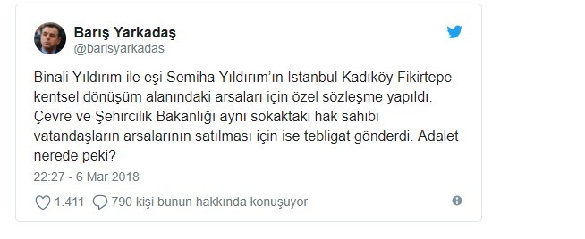 Fikirtepe özel kentsel dönüşüm pilot bölgesi iki gündür bu iddia ile çalkalanıyor… CHP İstanbul Milletvekili Barış Yarkadaş’ın resmi Twitter hesabından yazdığı mesajda Başbakan Binali Yıldırım ve eşi Semiha Yıldırım’ın Fikirtepe’deki arsası için ‘özel sözleşme yapıldığını’ iddia etmiş, Çevre ve Şehircilik Bakanlığı’nın aynı sokaktaki hak sahiplerine de arsaların satışı için tebligat gönderdiğini belirterek ‘Adalet nerede?’ diye sormuştu.