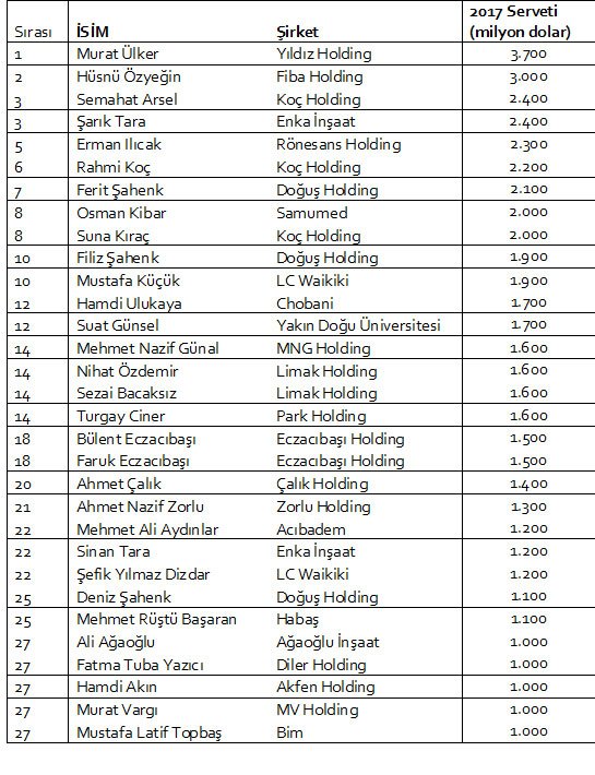 Ağaoğlu Şirketler Grubu Yönetim Kurulu Başkanı Ali Ağaoğlu ise bu yıl listede 1 milyar dolarlık servetiyle 27’inci sıradan girebildi. Ağaoğlu, geçen yıl 1,2 milyar dolarla listenin 20’inci sırasında yer almıştı.