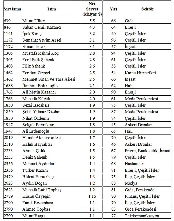 Öte yandan Forbes’un küresel dolar milyarderleri listesinde bu yıl toplam serveti 79,4 milyar dolar olan 35 Türk yer aldı.
