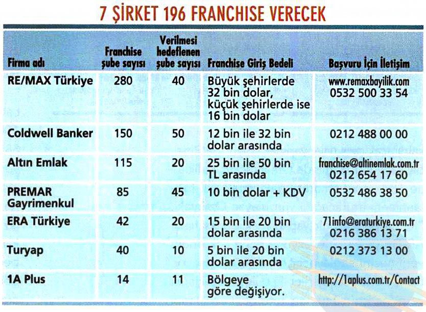 Gayrimenkul danışmanlığı arayışı girişim fırsatları yaratıyor. Bu çerçevede 7 şirket 2018 sonuna kadar 196 franchise ofis açmayı planlıyor. Türkiye’de 2017’de tapu dairelerinde yapılan satış işlemlerin değeri 309,3 milyar TL’yi buldu. Bu değerin ağırlıklı olarak belediyede gözüken rayiç değerler olduğu ifade ediliyor.