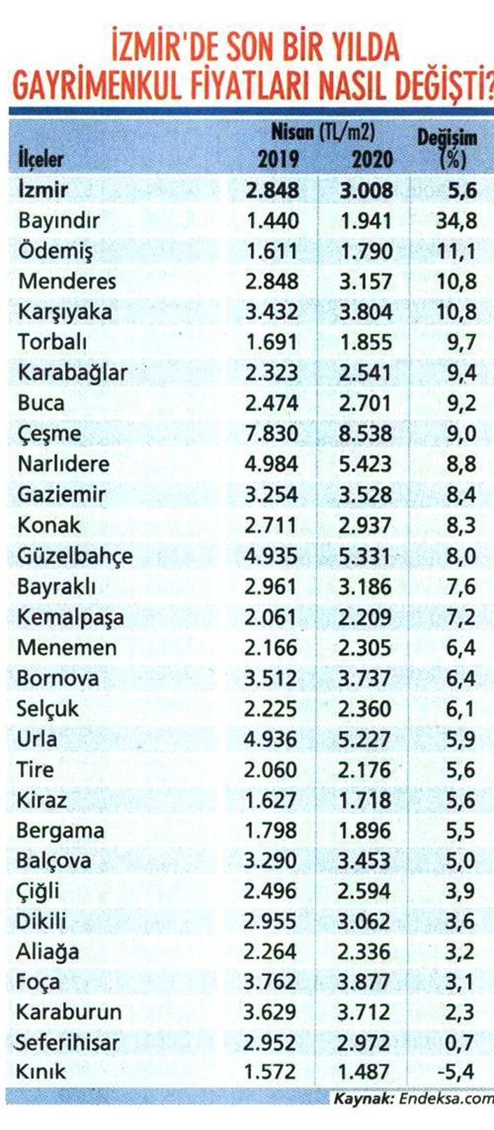 İzmir’de yüzde 34,8’lik artışla son bir yılda en çok değerlenen ilçe olan Bayındır’da geçtiğimiz yıl bin 440 TL olan m2 fiyatları olan m2 fiyatları bu yıl bin 941 TL’ye yükseldi. Yüzde 10.8’lik artış yaşanan Karşıyaka ilçesinde 2019’da 3 bin 432 TL olan Menderes’te geçtiğimiz yıl 2 bin 848 TL olan m2 fiyatları bu yıl 3 bin 157 TL’ye yükseldi.