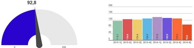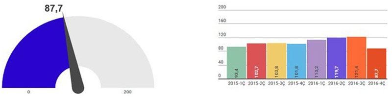 Reidin’in İş Bankası desteğiyle hazırladığı Türkiye gayrimenkul sektörü güven endeksi değeri, 2016 yılı 4. çeyrek döneminde geçen çeyrek döneme göre yüzde 27,7 azalışla 87,7 olarak ölçüldü. Uzmanlar bu değeri, ‘kısmen kötümser’ olarak yorumladı.