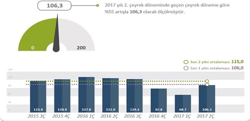 Türkiye gayrimenkul sektörü fiyat beklenti endeksi değeri, 2017 yılı 2. çeyrek döneminde geçen çeyrek döneme göre yüzde 55 artışla 106.3 olarak ölçüldü. Buna göre, gayrimenkul fiyatlarında geçmiş üç aylık döneme göre, önümüzdeki üç aylık dönemde fiyat artış beklentisi arttı.