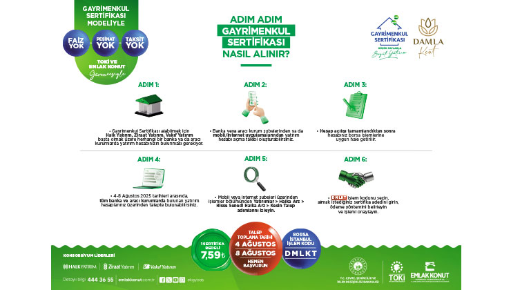 Çevre, Şehircilik ve İklim Değişikliği Bakanlığı koordinasyonunda Emlak Konut tarafından geliştirilen, SPK onayı alan geleceğin gayrimenkul finansman çözümü Gayrimenkul Sertifikası, halka arz oluyor. Sertifikalar, Borsa İstanbul’da 4-8 Ağustos 2025 tarihleri arasında “DMLKT” işlem kodu ile yatırımcılarla buluşacak. Gayrimenkul Sertifikası’nın halka arz fiyatı, değerleme fiyatı üzerinden %25 indirimle 7,59 TL olarak belirlendi. Bu model, küçük birikimlerle Damla Kent Projesi’nden ev sahibi olma fırsatı sunuyor.