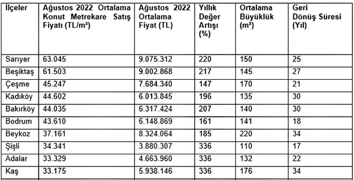 Yapılan çalışmaya göre Türkiye’nin en değerli ilçesi Sarıyer. Sarıyer’i, Beşiktaş ve Çeşme ortalama konut metrekare fiyatının en yüksek olduğu ilçeler olarak takip ediyor. Sarıyer’de ortalama konut metrekare fiyatı 63 bin 45 TL, ortalama konut fiyatı 9 milyon 75 bin 312 TL oldu. En değerli ilçeler listesinde ikinci sırada yer alan Beşiktaş’ta ise ortalama konut metrekare fiyatı 61 bin 503 TL, ortalama fiyat 9 milyon 2 bin 868 TL olurken, en değerli ilçeler listesinin üçüncü sırasında yer alan Çeşme’de ise konut fiyatları son 1 yılda %147 arttı. Çeşme’de ortalama konut metrekare fiyatı 45 bin 247 TL olurken, ortalama fiyat 7 milyon 684 bin 340 TL’yi buldu. Listede İstanbul’dan 7, İzmir, Muğla ve Antalya’dan birer ilçe yer aldı.