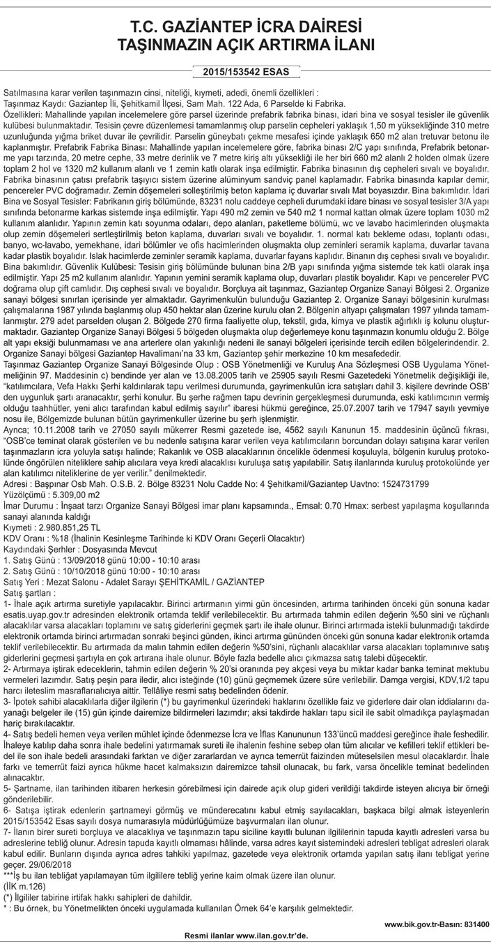 İnşaat tarzı OSB imar planı kapsamında bulunan bina 0.70 emsal ve sanayi alanında kaldığı için Hmax: serbest olarak izin verilmiş durumda. Kıymeti 2 milyon 980 bin 851 TL olarak kesinleşen varlığın ilk satışı 13 Eylül 2018 günü saat 10.00 – 10.10 arasında Adalet Sarayı’nın mezat salonunda gerçekleştirilecek. Alıcı çıkmadığı takdirde satış 10 Ekim 2018 günü aynı yer ve saatte tekrarlanacak.