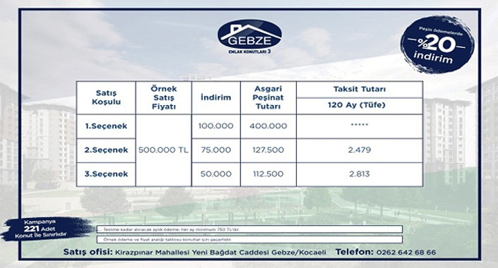 Gebze Emlak Konutları 3 projesinde 2+1 daireler 380 bin TL’ ile 474 bin TL arasında, 3+1 daireler 420 bin TL ile 594 bin TL, 4+1 daireler ise 602 bin TL ile 789 bin TL arasında satışa sunuluyor. Projede peşin alımlarda sadece 221 konut için yüzde 20 indirim uygulanıyor.