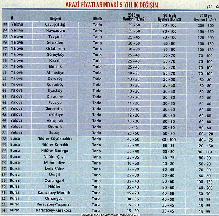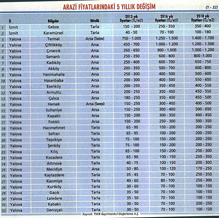 Değerlenmenin en yüksek olduğu Yalova Çavuşçiftliği’nde 2013 yılında tarlaların m2 satış fiyatı 35-50 TL iken 2018’de 200-300 TL’ye, Havuzdere’de 2013’te 35-50 TL iken 2018’de 250-250 TL’ye, Kılıç’ta 2013’te 65-100 TL iken 2018’de 250-300 TL’ye, Kocadere’de 2013 yılında 65-90 TL iken 2018 yılında 250-350 TL’ye kadar yükseldi.