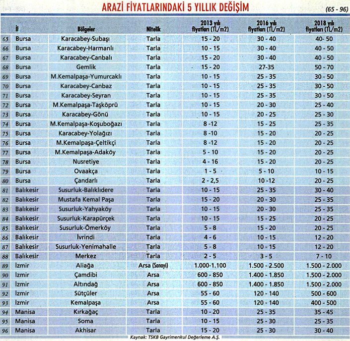 Otoyol güzergahında değer artışı görülen Bursa Nilüfer’de tarlaların m2 satış fiyatı 2013 yılında 35-40 TL iken 2018’de 140-200 TL’ye, Nilüfer-Büyükbalık’ta 2013 yılında 40-50 TL iken 2018’de 140-175 TL’ye, Nilüfer-Konaklı’da 2013 yılında 35-40 TL iken 2018’de 120-150 TL’ye ulaştı. İzmir Çamdibi ve Altındağ’da arsaların m2 satış fiyatı 2013 yılında 600-850 TL iken 2018 yılında bin 500-2 bin TL’ye, Sütçüler’de 2013 yılında 55-60 TL iken 2018 yılında 500-600 TL’ye, Kemalpaşa’da 2013 yılında 55-60 TL iken 2018 yılında 400-500 TL’ye yükseldi.
