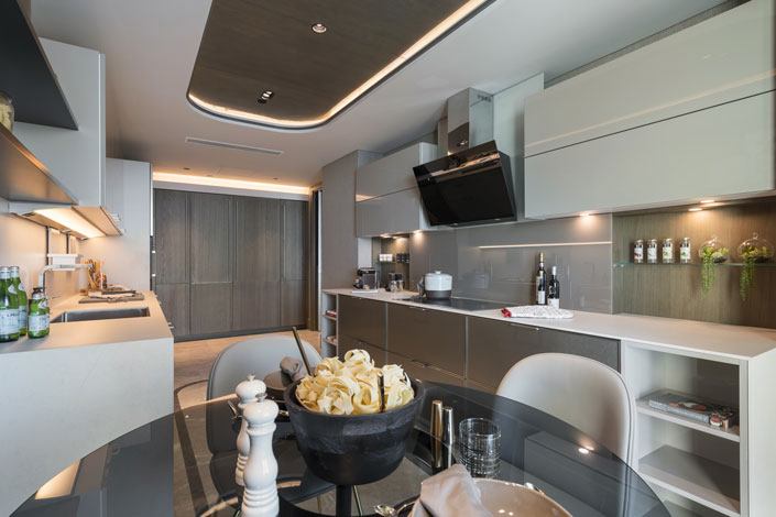 Teknolojik olarak geliştirilmiş laminatların mutfağı oluşturan farklı modüllerde bir arada kullanılabildiğini belirten mimar, aynı yalın görüntünün daha lüks bir tasarımla 2 mm inceliğe kadar kesilmiş lamine mermerler kullanılarak oluşturulabileceğini iletiyor.