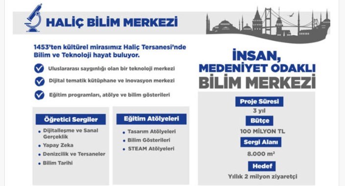 Cumhurbaşkanı Recep Tayyip Erdoğan, Twitter hesabından yaptığı paylaşımda, “İstanbul Haliç’te Bilim Merkezi kuruyoruz. İnsan ve medeniyet odaklı Bilim Merkezimiz yılda 2 milyon ziyaretçi alacak, bilime katkı sağlayacak.” ifadelerine yer verdi.