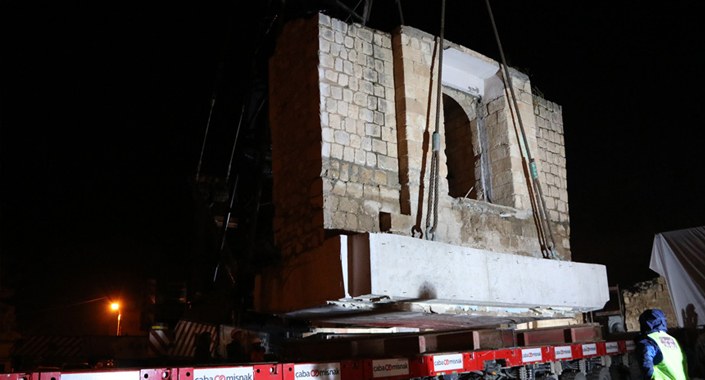 Toplam 115 ton ağırlığındaki bahçe duvarları ile caminin kapısı 48 tekerlekli SPMT aracına yüklendi.