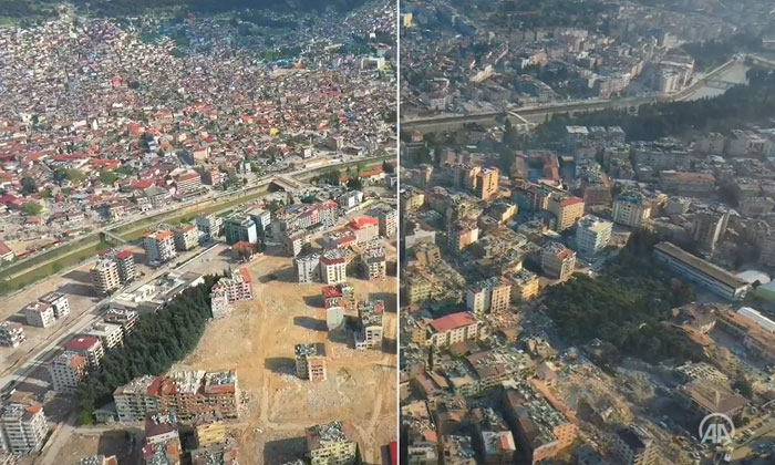 Bölgenin deprem öncesi, sonrası ve devam eden enkaz kaldırma çalışmalarıyla geldiği son durum, dronla görüntülendi.