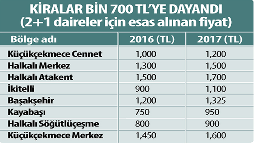 En fazla yükseliş Halkalı’da gerçekleşti. Bölgede satılık konut metrekareleri 3 bin 700 liradan 4 bin 250 liraya çıktı. Bu rakam, Küçükçekmece Cennet’te 3 bin liradan 3 bin 250 liraya, Başakşehir’de 3 bin 450 liradan 3 bin 700 liraya, Kayabaşı’nda 2 bin 400 liradan 2 bin 800 liraya ve Küçükçekmece Merkez’de 3 bin 200 liradan 3 bin 500 liraya kadar yükseldi. Söz konusu geçiş güzergahındaki bölgelerde iki oda bir salon (2+1) dairelerde kiralar da ortalama 750 liradan bin 600 liraya çıktı. Böylelikle son bir yılda Küçükçekmece Cennet’de 2+1 daire kirası bin liradan bin 200 liraya, Halkalı’da bin 300 liradan bin 500 liraya, Halkalı Atakent’te bin 500 liradan bin 700 liraya, Küçükçekmece Merkez’de bin 450 liradan bin 600 liraya, Kayabaşı’nda 750 liradan 950 liraya ulaştı.