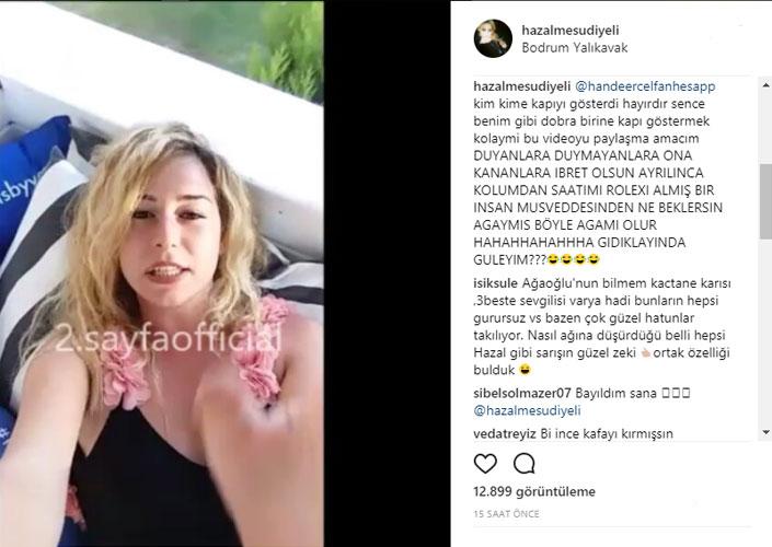 - Hazalmesudiyeli @handeercelfanhesapp Kim kime kapıyı gösterdi? Hayırdır? Sence benim gibi dobra birine kapı göstermek kolay mı? Bu videoyu paylaşma amacım duyanlara duymayanlara ona kananlara ibret olsun. Ayrılınca kolumdan saatimi, Rolex’i almış bir insan musveddesinden ne beklersin. Ağa’ymış. Böyle Ağa’mı olur? Hahahhahahhha.. Gıdıklayın da güleyim???