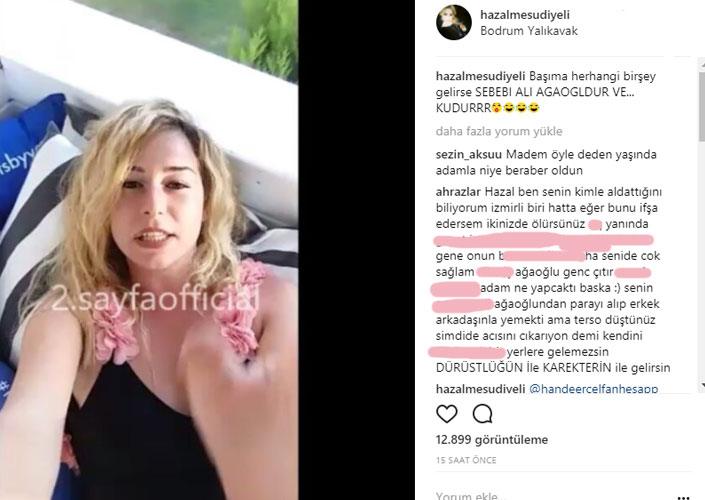 Ağaoğlu Şirketler Grubu Yönetim Kurulu Başkanı Ali Ağaoğlu’nun başını 2.5 yıl aşk yaşadığı eski sevgilisi Hazal Mesudiyeli ağrıtıyor. Sosyal medya hesabından paylaştığı videoda ve yorumlarında Ali Ağaoğlu’na veryansın eden Mesudiyeli, “Başıma herhangi bir şey gelirse sebebi Ali Ağaoğlu’dur… Kudurrr” ifadelerini kullandı.